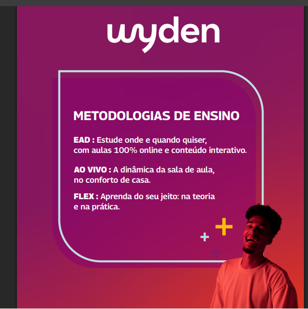 A Wyden é uma instituição notória em ensino. Com valores atrelados à qualidade, foco no aluno, senso de dono e resultado, pessoas, diversidade e ética, hoje a marca é referência em qualidade. Em números, a Wyden conta com mais de 50 mil alunos matriculados em cursos de graduação e pós-graduação. O modelo de ensino EaD traz flexibilidade e possibilidade de estudar de qualquer lugar. O diferencial está no portfólio de professores renomados com qualificações em mestrado e doutorado e o atendimento personalizado no polo de ensino para atender sua necessidade.